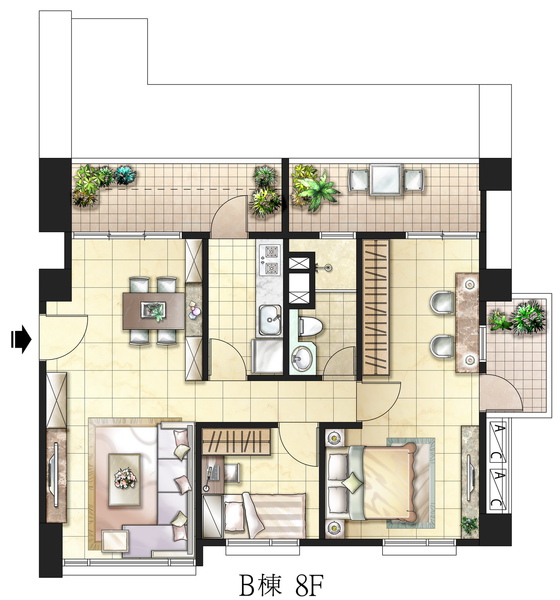 這間房子最吸引阿奇特克的,是她的景觀,由於是在八樓,視野本來就不錯了,主臥室卻擁有一個陽光露台及景觀陽台,真是更棒了,在露台可以種植一些綠色植物,曬太陽喝個下午茶,或是假日早晨在陽台遠眺山水吃個早午餐,都是不錯的生活品質。柱子落在房子的四個角落,室內沒有柱子,讓空間使用沒有虛坪,而且未來容易調整隔間。一層兩戶很單純,而且梯廳採光佳,入口處還有多一個戶外露台,感覺很棒。